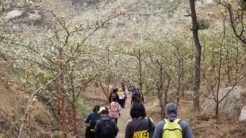 晨光熹微时,我们揣着自备的早餐启程,车上大家相互认识,领队同大家分享户外爬山常识。载着欢声笑语的车辆在春风里颠簸三个半小时,泊进北镇医巫闾山的臂弯。此刻你会看到梨云坠露的满山“春雪”,我们云游在漫山遍野的梨花中,微风徐徐,片片花瓣洋洋洒洒飘落,落在我们发髻、肩膀、手心中,让我们感受到春意盎然。中午找一处幽静之地,拿出我们带的路餐,在这山野中伴着美食一同吸取大地山川之灵气。约下午15点徒步爬山到终点,我们踏上回家的路,车上我们互相交换照片,分享出行感受,在晚20:00左右到达温馨的家。