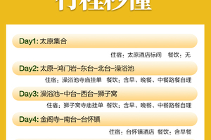 2、第1晚太原酒店标间,第2晚寺庙挂单,第3晚寺庙挂单,第4晚台怀镇酒店标间